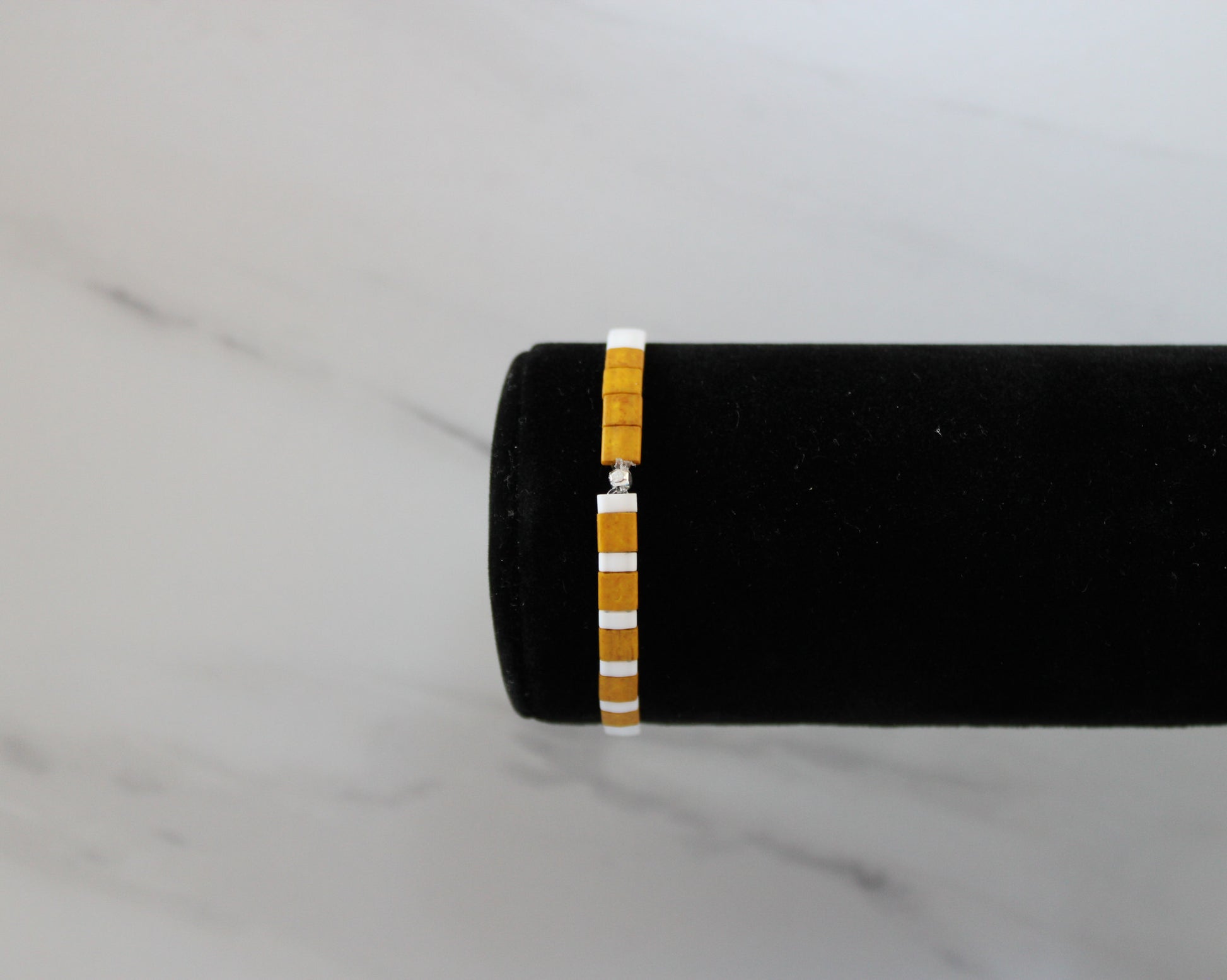 Add a pop of color with this mustard yellow and white Tila bead bracelet. The warm mustard yellow and clean white beads create a vibrant yet balanced look, perfect for adding a touch of personality to any outfit.
