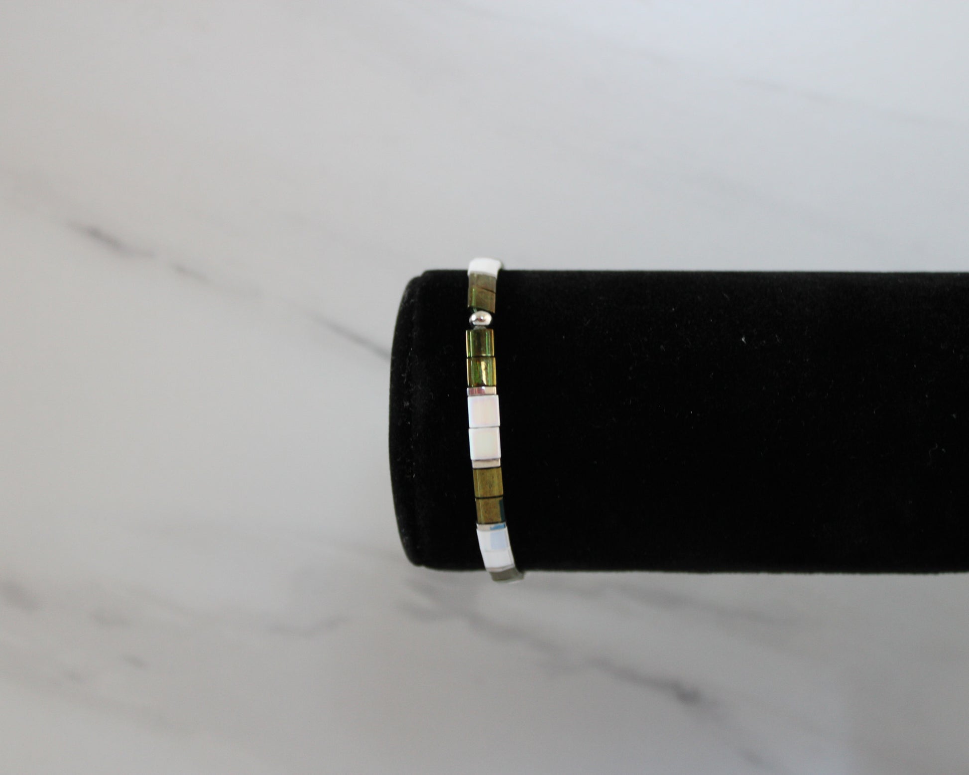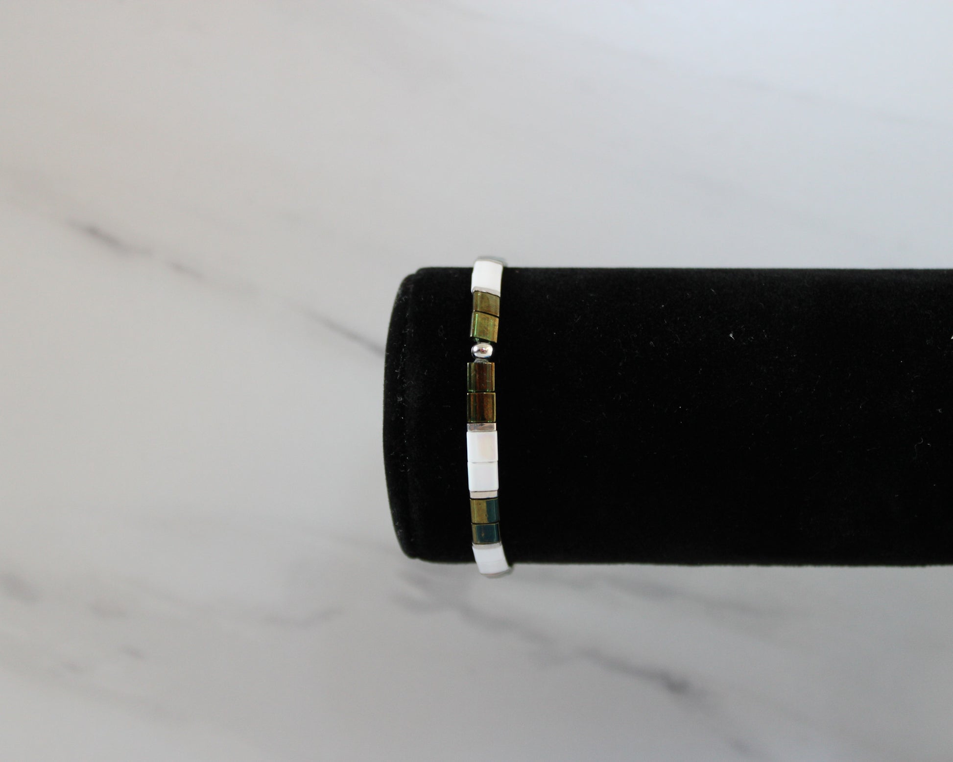 The "Joy" Tila bead bracelet features dark green beads with an alternating white and silver bead pattern. Its vibrant color contrast adds a playful yet elegant touch, making it a stylish and unique accessory.