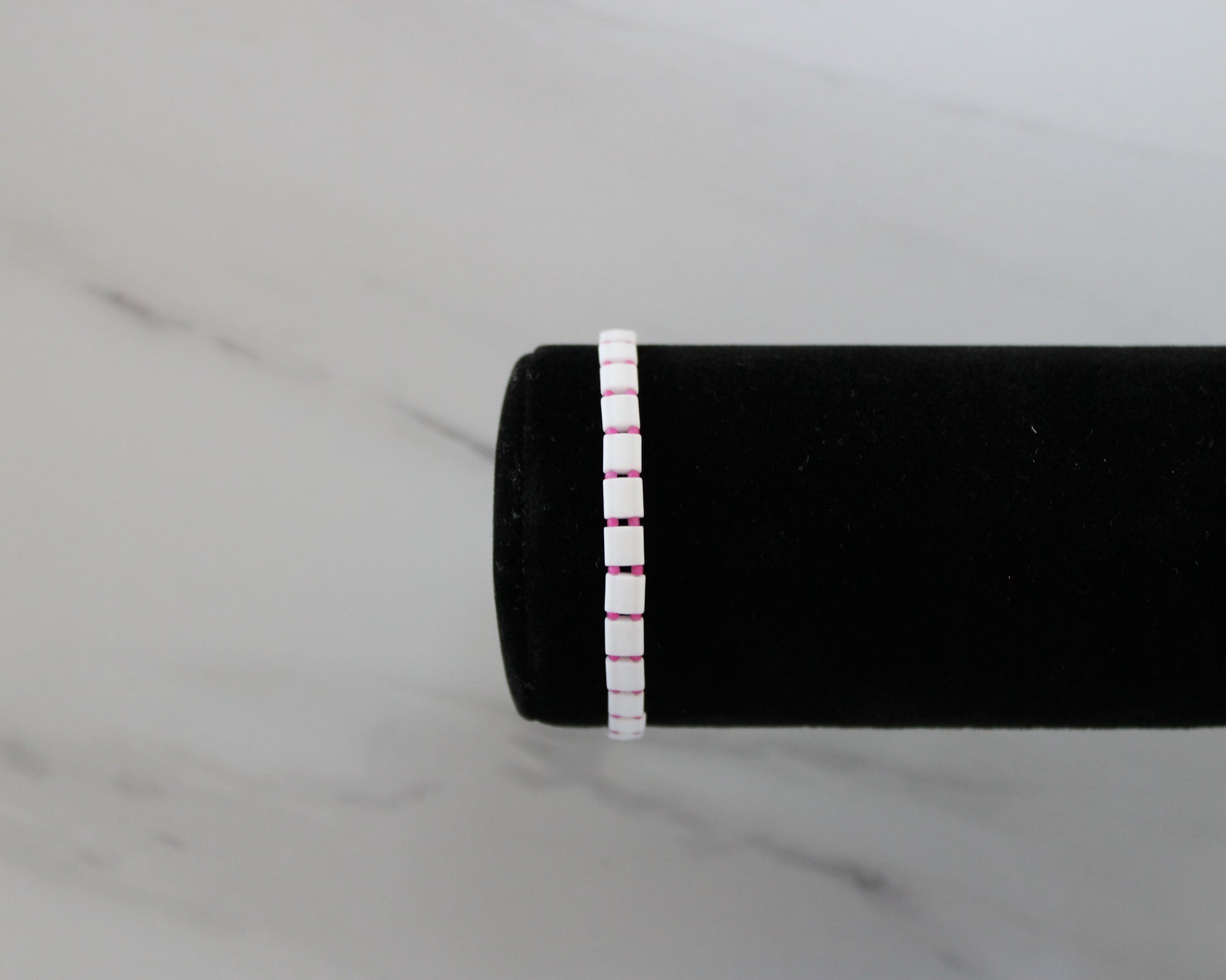 This Tila bead bracelet features sleek white beads interspersed with vibrant hot pink beads, creating a bold and eye-catching design. The clean white beads provide a fresh, crisp backdrop, while the hot pink accents add a fun pop of color, making this bracelet a lively and playful statement piece.