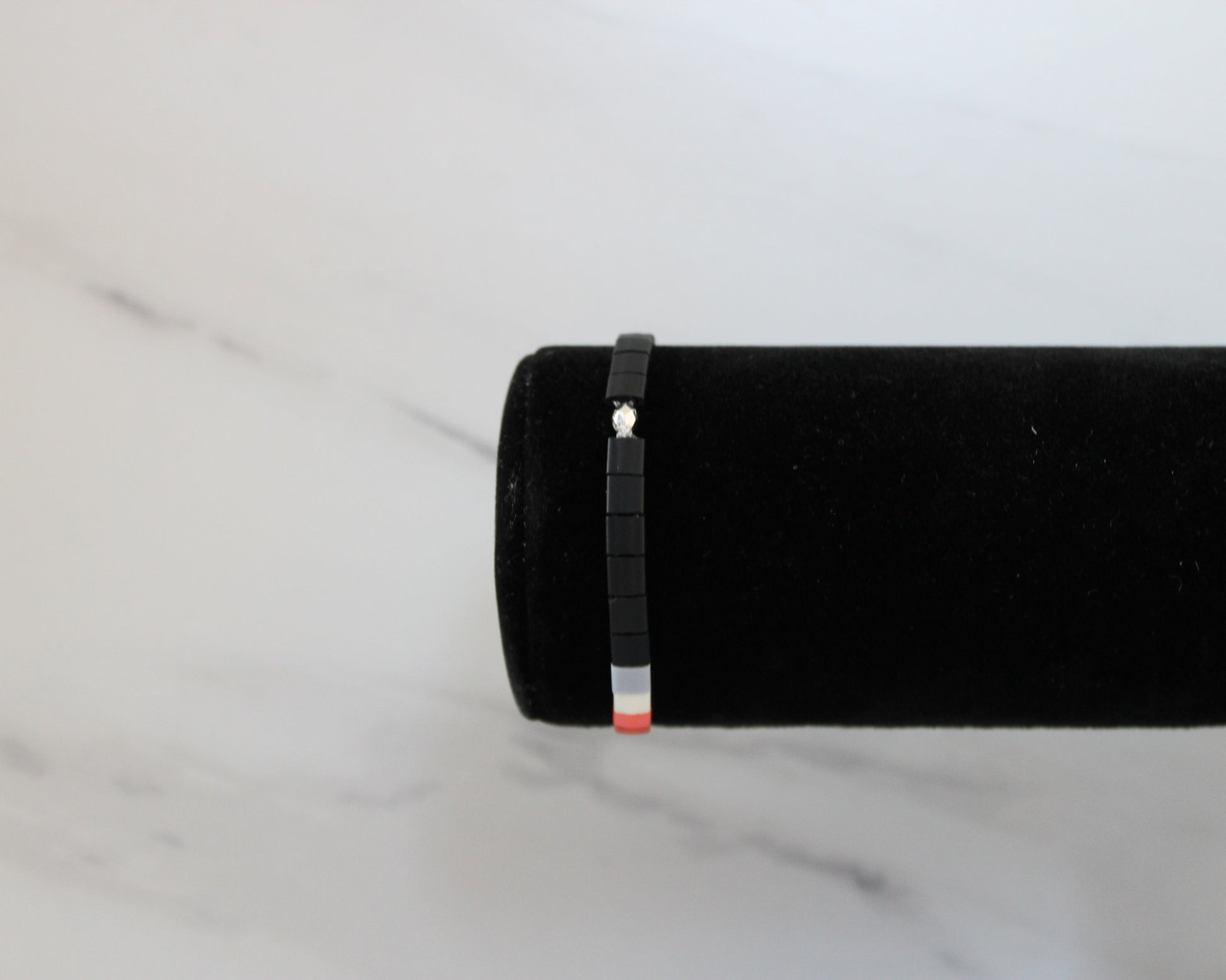Add a vibrant touch to your style with this eye-catching Tila bead bracelet. The design combines deep black beads with a lively mix of red, orange, pink, gray, and ivory accents, creating a distinctive and funky look.