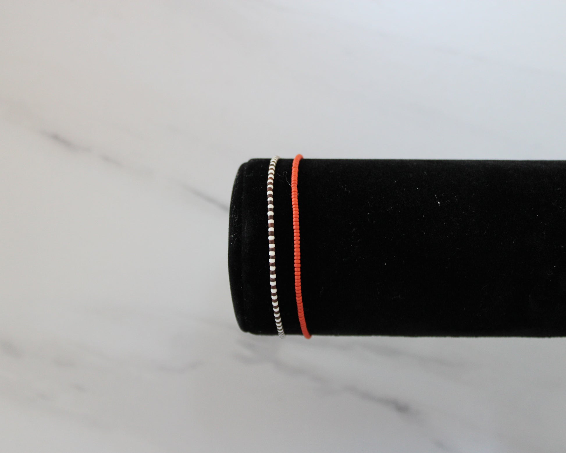 This micro bead bracelet set features two distinct yet complementary designs. The first bracelet showcases a rich rusty orange hue, creating a warm, earthy vibe. The second bracelet alternates between an off white and deep brown beads, offering a sharp, structured pattern with a sophisticated, neutral palette.