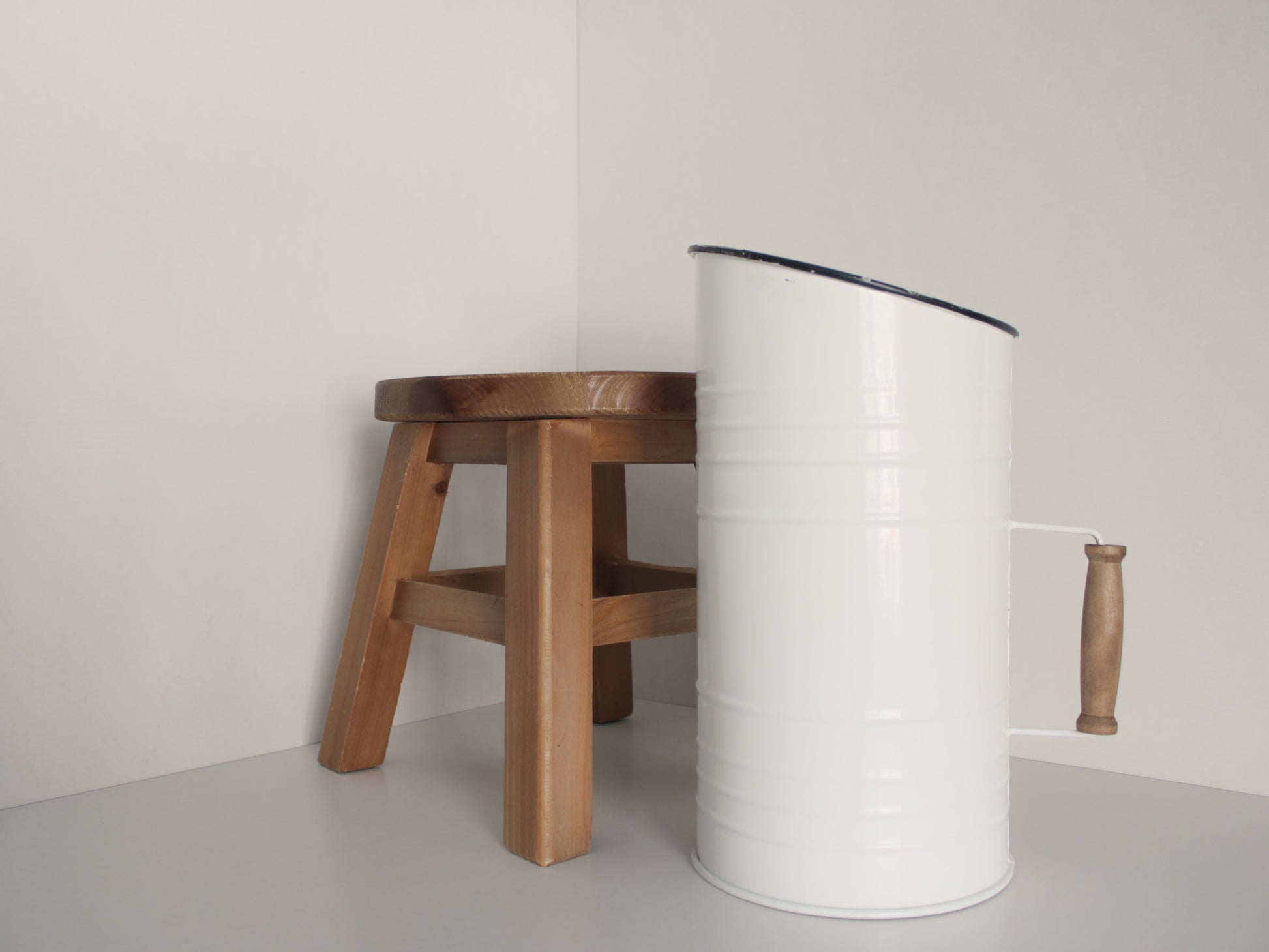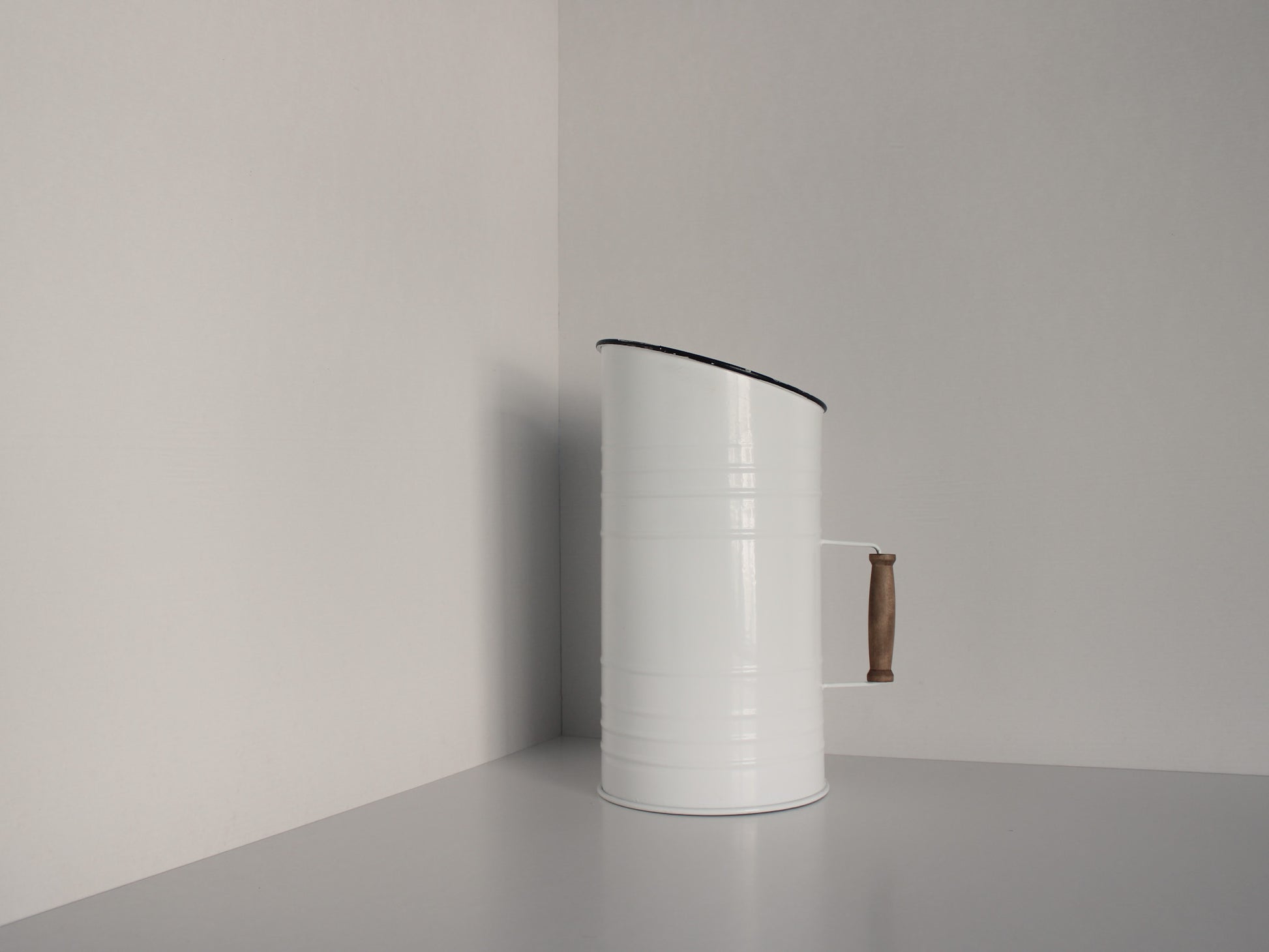 The distressed black edging along the white pitcher enhances its vintage appeal, while the sturdy wooden handle adds a natural touch. Ideal for displaying fresh or artificial flowers, this versatile pitcher brings a warm and inviting feel to any room.